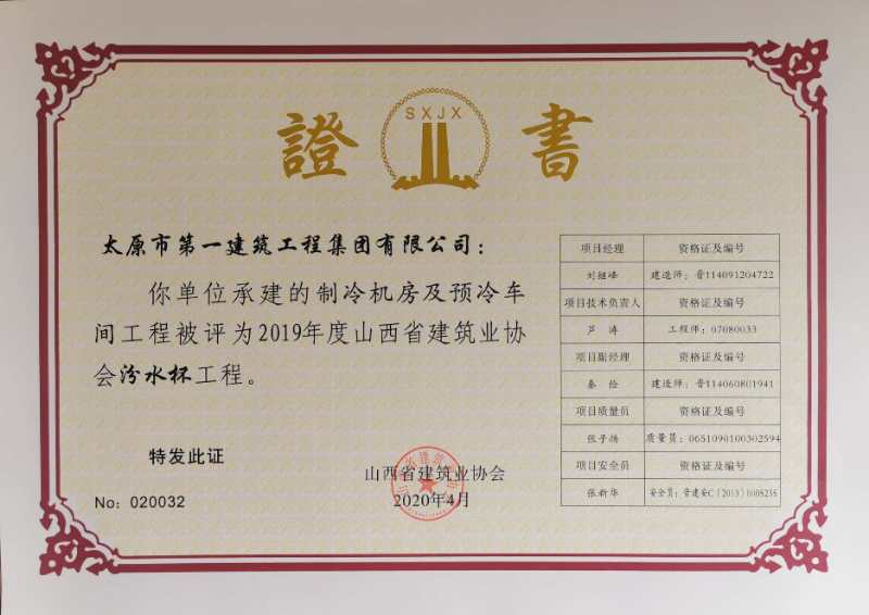 制冷機(jī)房及預(yù)冷車間項(xiàng)目榮獲2019年度山省建筑業(yè)協(xié)會(huì)汾水杯獎(jiǎng)