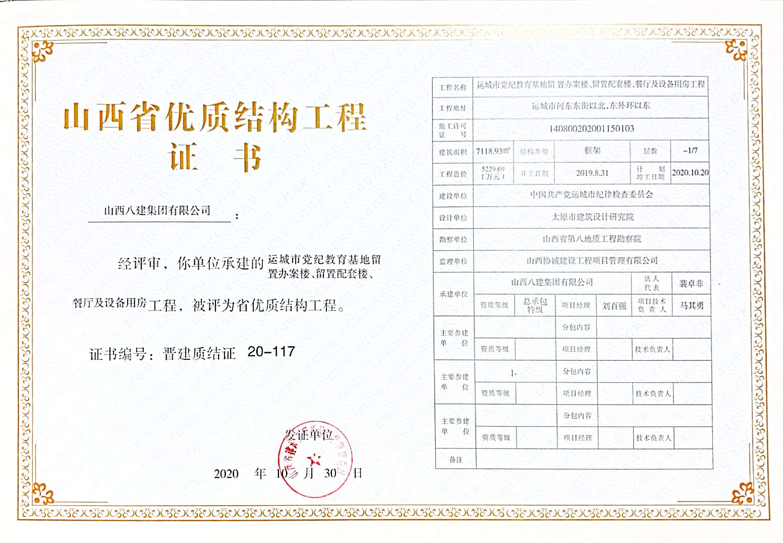 運城市黨紀教育基地留置辦案樓、留置配套樓、餐廳及設備用房榮獲2020年山西省優(yōu)質(zhì)結(jié)構(gòu)工程獎