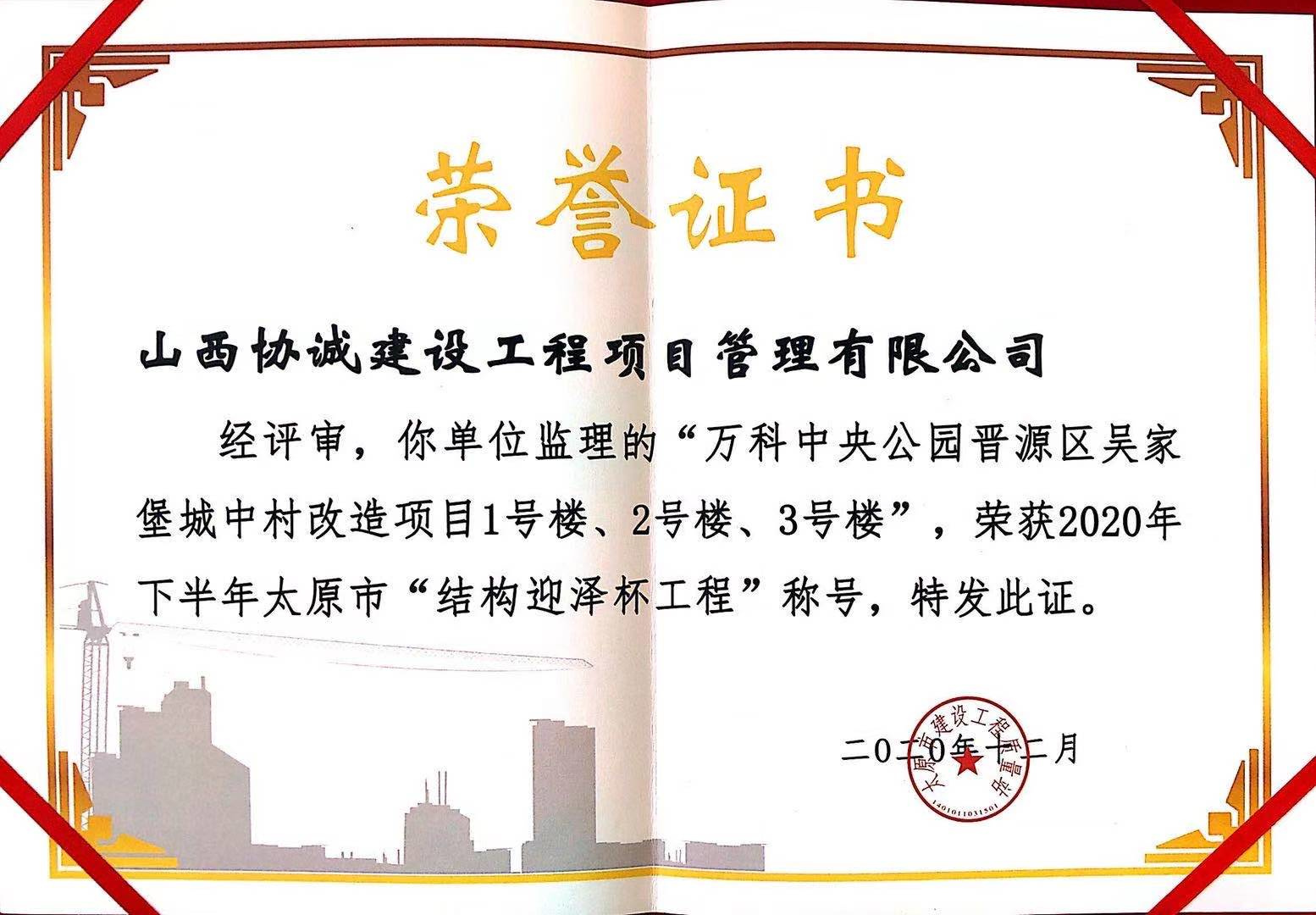 萬科中央公園項(xiàng)目榮獲2020年下半年太原市結(jié)構(gòu)迎澤杯工程獎(jiǎng)