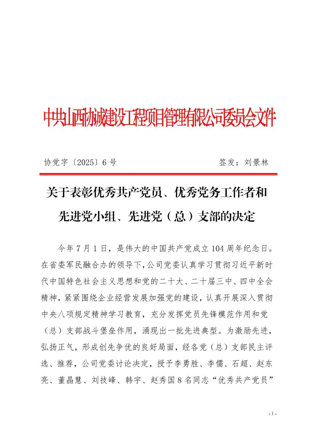 今年7月1日,是偉大的中國共產(chǎn)黨成立104周年紀(jì)念日。在上級(jí)和公司黨委的領(lǐng)導(dǎo)下,協(xié)誠的廣大共產(chǎn)黨員和基層黨組織認(rèn)真學(xué)習(xí)貫徹習(xí)近平新時(shí)代中國特色社會(huì)主義思想和黨的二十大、二十屆三中、四中全會(huì)精神,緊緊圍繞企業(yè)經(jīng)營發(fā)展加強(qiáng)黨的建設(shè),認(rèn)真開展深入貫徹中央八項(xiàng)規(guī)定精神學(xué)習(xí)教育,充分發(fā)揮黨員先鋒模范作用和黨(總)支部戰(zhàn)斗堡壘作用,涌現(xiàn)出一批先進(jìn)典型。為激勵(lì)先進(jìn),弘揚(yáng)正氣,自覺把習(xí)近平新時(shí)代中國特色社會(huì)主義思想作為行動(dòng)指南,始終做到忠誠干凈擔(dān)當(dāng),在推進(jìn)企業(yè)高質(zhì)量發(fā)展實(shí)踐中,形成奮發(fā)有為,建功立業(yè)的“創(chuàng)先爭(zhēng)優(yōu)”良好局面,“七一”來臨之前,公司黨委研究決定,對(duì)評(píng)選推薦出的“優(yōu)秀共產(chǎn)黨員”、“優(yōu)秀黨務(wù)工作者”、“先進(jìn)黨小組”、“先進(jìn)黨(總)支部”予以表彰。