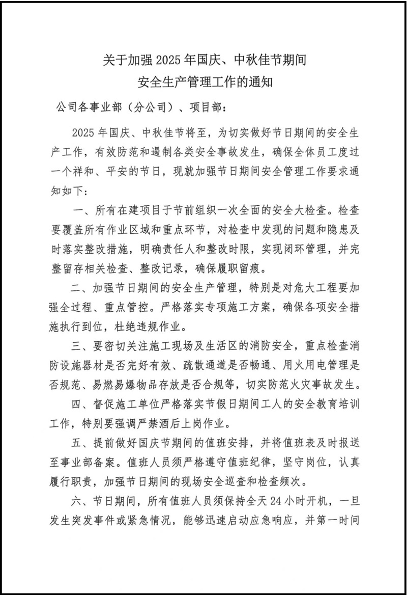 關(guān)于加強2025年國慶、中秋佳節(jié)期間安全生產(chǎn)管理工作的通知
