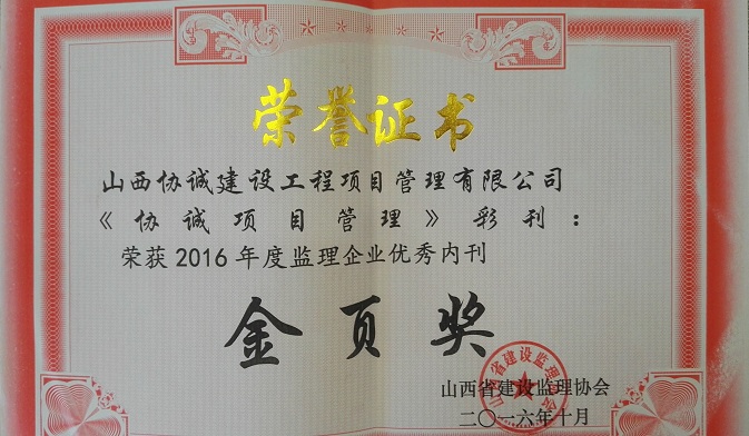 公司《協(xié)誠項目管理》彩刊榮獲“2016年度監(jiān)理企業(yè)優(yōu)秀內刊金頁獎”